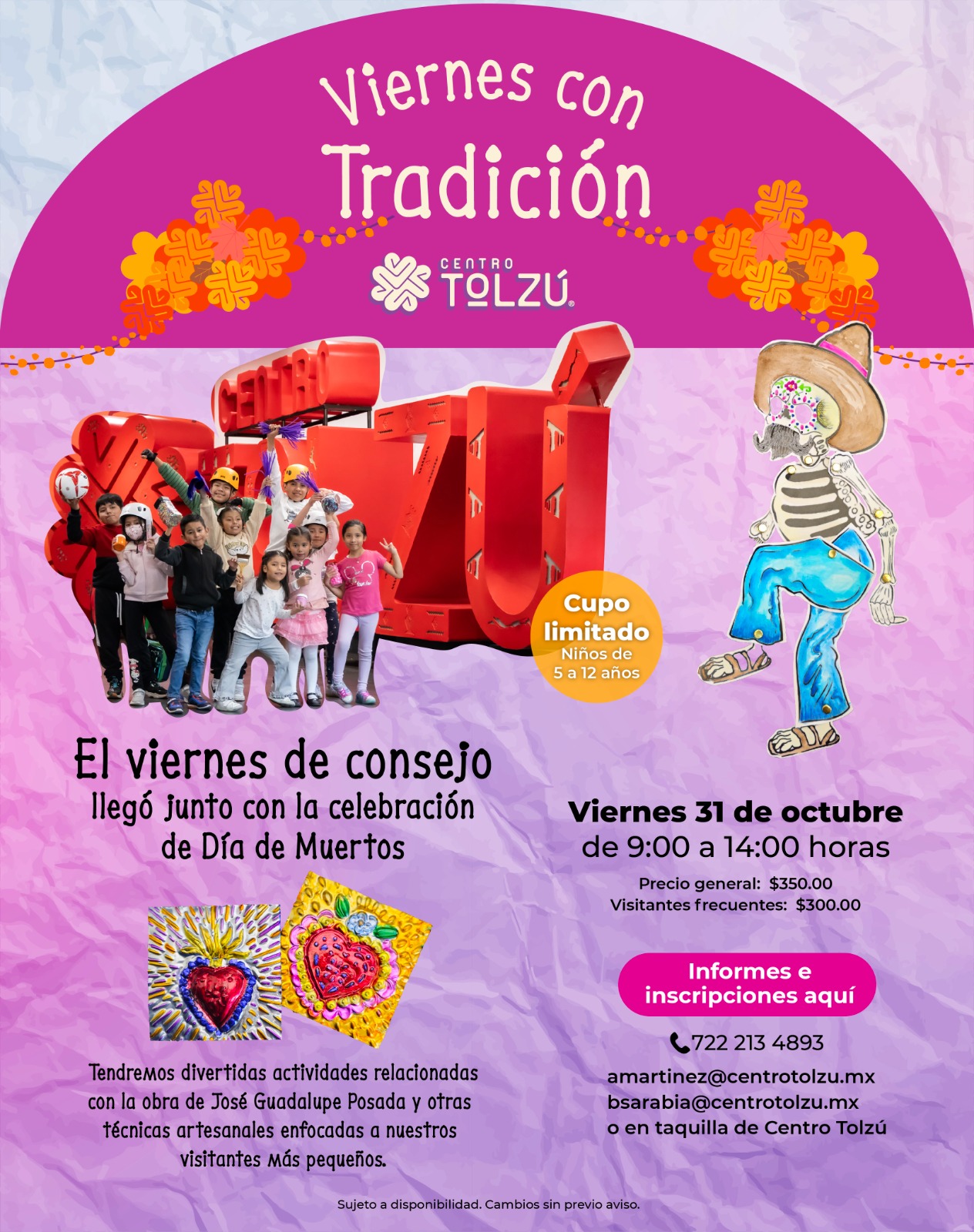 😉 Tráelos a Centro Tolzú a vivir increíbles actividades para que pasen un día lleno de creatividad, arte y mucha diversión. En octubre llega: ¡Viernes de Tradición! 🏵️💀
